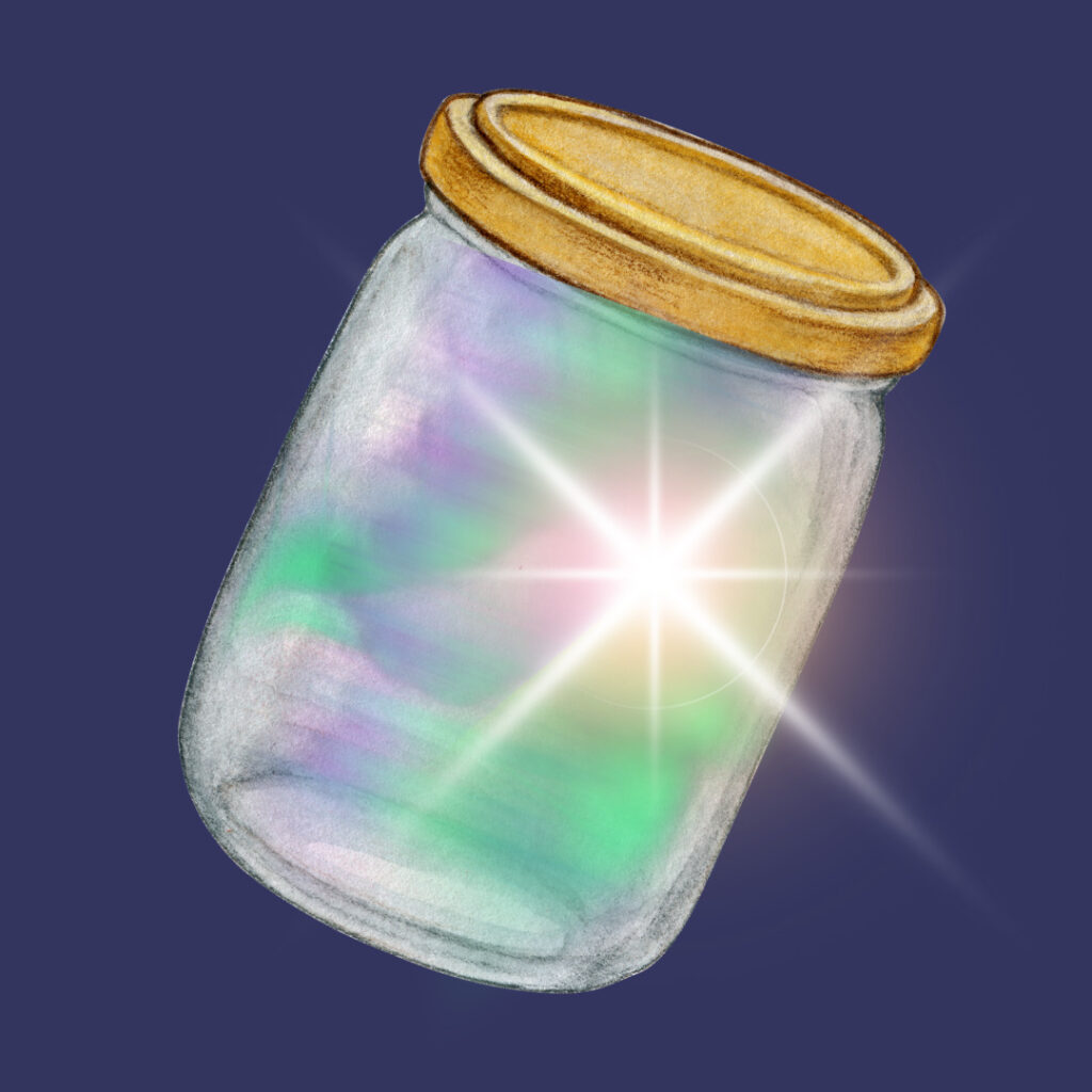 “Minulla on tapana arvata tällaiset asiat”, Pukki sanoo. Sitten hän sujauttaa kätensä yhteen hänen punaisen nuttunsa lukuisista taskuista ja vetää esiin lasipurkin, jonka sisällä pyörteilevät kirkkaanvihreät ja violetinpunertavat valot. Se oli kauneinta, mitä Elli oli koskaan nähnyt.